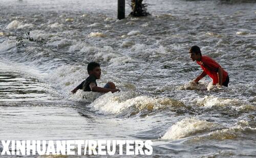 5月7日,在巴西東北部皮奧伊州的埃斯佩蘭蒂納,孩子們?cè)诒缓樗蜎]的街道上玩耍。巴西有關(guān)部門表示,多日來暴雨導(dǎo)致的洪水和泥石流已經(jīng)造成至少33人死亡,21.4萬人無家可歸。 新華社/路透