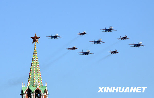 5月9日,在俄羅斯首都莫斯科舉行的閱兵式上,俄羅斯空軍飛機(jī)編隊(duì)飛過莫斯科紅場上空。當(dāng)日,俄羅斯舉行盛大閱兵式,慶祝衛(wèi)國戰(zhàn)爭勝利64周年。新華社記者高帆攝