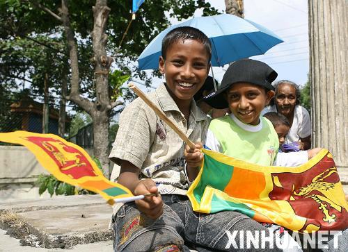 5月19日,在斯里蘭卡首都科倫坡,兩名少年手拿國(guó)旗參加慶祝儀式,慶祝歷時(shí)26年的斯內(nèi)戰(zhàn)宣告結(jié)束。斯里蘭卡總統(tǒng)拉賈帕克薩當(dāng)日說,斯政府軍已在打擊反政府武裝泰米爾伊拉姆猛虎解放組織(猛虎組織)的軍事行動(dòng)中取得最后勝利,斯政府今后將尋求通過政治手段解決長(zhǎng)期困擾斯里蘭卡的民族問題。新華社記者劉詠秋攝