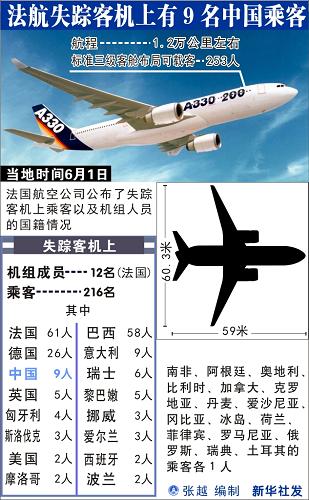 從巴西里約熱內(nèi)盧飛往巴黎的法航AF447班機格林尼治時間6月1日在大西洋上失蹤,這架飛機上共有228人。法國交通部2日公布了失事飛機乘客名單,稱客機上中國乘客的人數(shù)為9名。