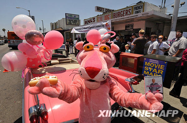 6月24日,在美國洛杉磯街頭,一名裝扮成粉紅豹形象的宣傳者在一家熱狗店門前為新片《粉紅豹2》的DVD和藍光光盤的發(fā)行作宣傳。新華社/法新