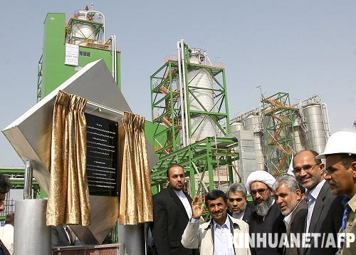 6月25日,在伊朗首都德黑蘭以南約1200公里的邁赫爾石化設(shè)備廠,伊總統(tǒng)艾哈邁迪-內(nèi)賈德(左二)出席落成典禮。艾哈邁迪-內(nèi)賈德當(dāng)日發(fā)表講話,敦促美國總統(tǒng)奧巴馬停止干涉伊朗的內(nèi)部事務(wù)。 新華社/法新