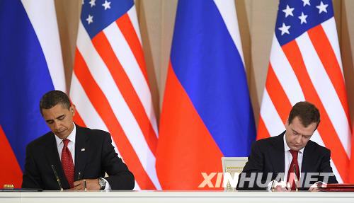 7月6日,在俄羅斯首都莫斯科,俄羅斯總統(tǒng)梅德韋杰夫與美國總統(tǒng)奧巴馬在簽字儀式上簽署文件。當(dāng)日,俄美雙方通過了關(guān)于反導(dǎo)問題、核領(lǐng)域合作、阿富汗問題等聯(lián)合聲明。新華社記者魯金博攝
