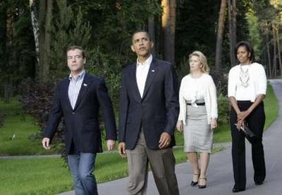 7月6日,俄羅斯總統(tǒng)梅德韋杰夫在莫斯科與到訪的美國總統(tǒng)奧巴馬舉行會談。奧巴馬當(dāng)日抵達莫斯科進行為期三天的訪問,這是他就任總統(tǒng)以來首次訪問俄羅斯。
