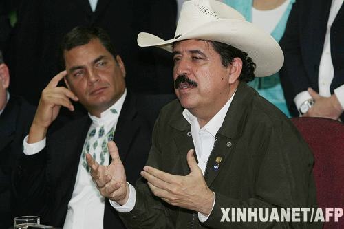 7月5日,在薩爾瓦多的國際機場,洪都拉斯被罷免總統(tǒng)塞拉亞(右)在新聞發(fā)布會上發(fā)表講話。當(dāng)天,洪都拉斯被罷免總統(tǒng)塞拉亞乘專機從華盛頓飛往洪首都特古西加爾巴,洪臨時政府軍隊在跑道上設(shè)置障礙阻止專機降落,專機被迫飛往尼加拉瓜首都馬那瓜,隨后抵達薩爾瓦多。新華社/法新