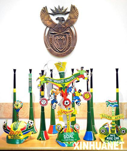 6月29日,世界杯推廣活動上的2010年世界杯宣傳紀念品。當日,南非共和國駐香港特別行政區(qū)領事館舉行新聞發(fā)布會宣布,南非政府為慶祝2010年主辦世界杯,將在香港舉行為期一年的推廣活動。新華社記者盧炳輝攝