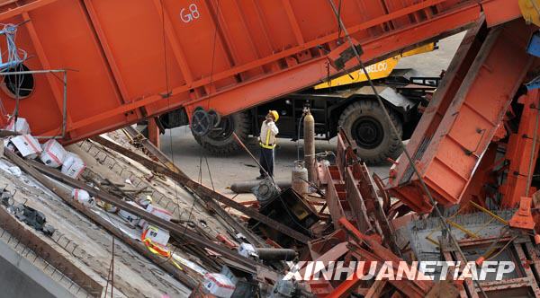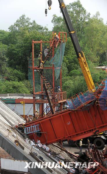 7月12日,在印度首都新德里發(fā)生高架橋坍塌事故的現(xiàn)場,救援人員動用吊車清理現(xiàn)場。新華社/法新