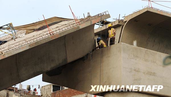 7月12日,工人在印度首都新德里發(fā)生的高架橋坍塌事故現(xiàn)場查看。新華社/法新