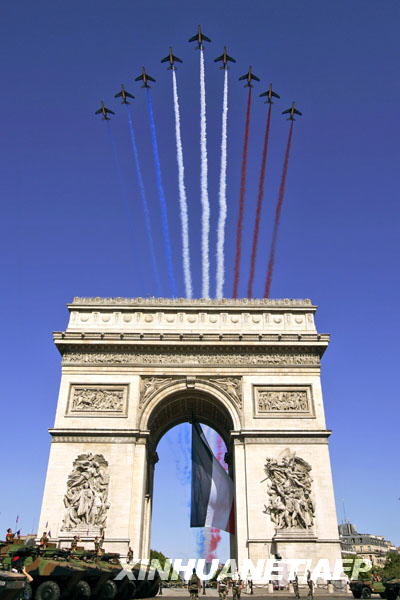 7月14日,在法國首都巴黎舉行的國慶日閱兵式上,法國空軍“法蘭西巡邏兵”飛行表演隊從凱旋門上空飛過。當日是法國國慶日,法國按慣例在巴黎舉行閱兵式等一系列活動進行慶祝。新華社/法新