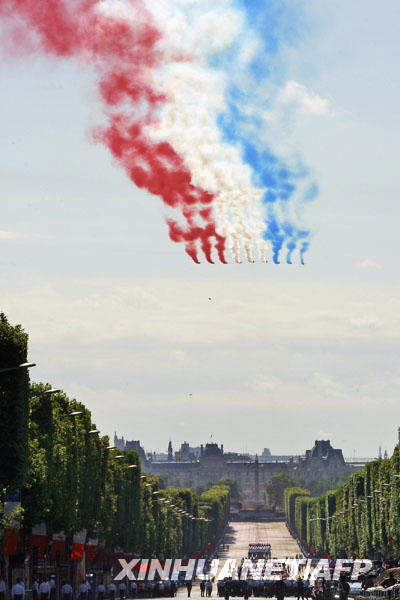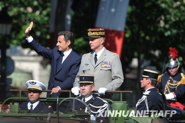 7月14日,法國總統(tǒng)薩科齊(后排左)在巴黎香榭麗舍大街舉行的國慶日閱兵式上向人群揮手。當日是法國國慶日,法國按慣例在首都巴黎舉行閱兵式等一系列活動進行慶祝。新華社/法新