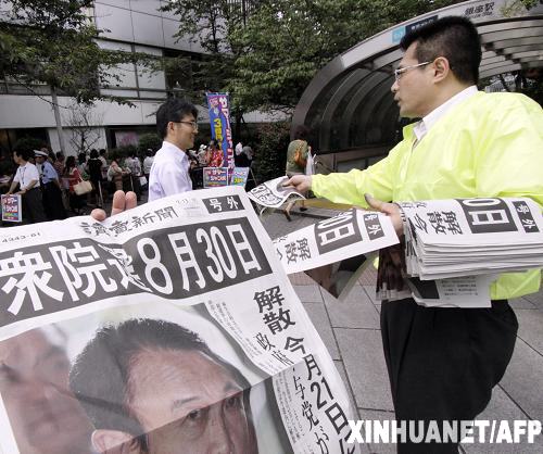 7月13日,一名日本男子在東京分發(fā)刊登舉行眾議院大選消息的報(bào)紙?zhí)乜。?jù)日本媒體報(bào)道,日本首相麻生已同意下周解散眾議院,并在8月30日舉行大選。新華社/法新