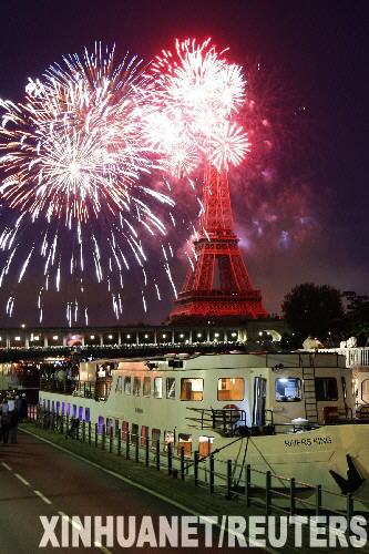 2009年7月14日 埃菲爾鐵塔上空燃放焰火慶國(guó)慶 7月14日,在法國(guó)首都巴黎,焰火在埃菲爾鐵塔上空燃放。當(dāng)日,法國(guó)慶祝第220個(gè)國(guó)慶日以及埃菲爾鐵塔落成120周年。 新華社/路透