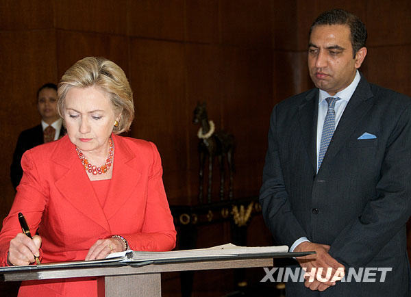 7月18日,在印度孟買的泰姬瑪哈酒店,到訪的美國國務卿希拉里·克林頓(前左)在留言簿上簽名。希拉里于17日晚到達孟買,開始對印度的數天正式訪問。這是希拉里就任美國國務卿以來對印度的首次訪問。新華社發(fā)
