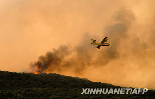 7月23日,在意大利撒丁島,一架飛機(jī)在失火的山林滅火。