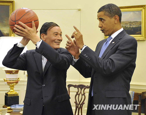 7月28日,美國總統(tǒng)奧巴馬在首都華盛頓白宮會見正在華盛頓出席首輪中美戰(zhàn)略與經(jīng)濟(jì)對話的中國國家主席胡錦濤特別代表、國務(wù)院副總理王岐山和國務(wù)委員戴秉國一行。這是奧巴馬(右)向王岐山贈送籃球。新華社記者張巖攝