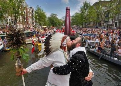 中新網(wǎng)8月4日電 荷蘭阿姆斯特丹市長(zhǎng)科恩8月1日為五對(duì)同性戀人主持婚禮,掀起該市支持同性戀者年度水上大游行的高潮。