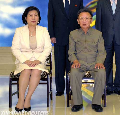 這張朝鮮中央通訊社提供的照片顯示,8月16日,朝鮮最高領導人金正日(右)和來訪的韓國現(xiàn)代集團會長玄貞恩合影。據(jù)朝鮮中央通訊社17日報道,朝鮮最高領導人金正日16日在會見來訪的韓國現(xiàn)代集團會長玄貞恩時,滿足了她提出的所有要求。雙方還表示將積極發(fā)展合作,以促進民族共同繁榮。 新華社/路透