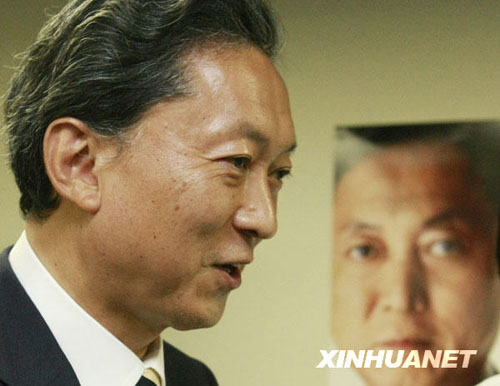 8月31日,在日本東京民主黨總部,民主黨黨首鳩山由紀(jì)夫在結(jié)束與黨內(nèi)高層舉行的會(huì)議后,從民主黨大選海報(bào)前走過(guò)。新華社記者任正來(lái)攝