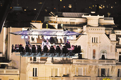 這項(xiàng)為期5天的活動(dòng),由法國美食雜志贊助推出,12名巴黎最精英的廚師制作美食?腿藗儗⑹紫茸谝粋(gè)有玻璃頂?shù)钠脚_上,固定在類似過山車的大軟座椅上,隨后有起重機(jī)慢慢將玻璃頂上的金屬繩索吊起,將整個(gè)平臺懸空在杜伊勒利花園上空50米,一桌可坐22人。