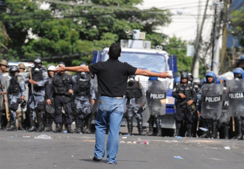 9月23日,在洪都拉斯首都特古西加爾巴,一名抗議者與警察對(duì)抗