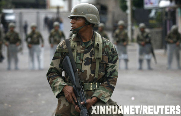 9月24日,士兵在洪都拉斯首都特古西加爾巴的巴西駐洪都拉斯大使館外警戒。據(jù)路透社報(bào)道,當(dāng)日洪都拉斯警方和遭罷免總統(tǒng)塞拉亞的支持者之間的沖突造成1人死亡。新華社/路透