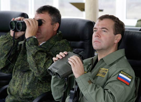 據(jù)英國《每日電訊報(bào)》28日?qǐng)?bào)道,近日,俄羅斯正同白俄羅斯在加里寧格勒地區(qū)展開聯(lián)合軍事演習(xí)。俄羅斯總統(tǒng)梅德韋杰夫也身著軍裝出現(xiàn)在演習(xí)現(xiàn)場,他甚至端起一把機(jī)槍,并且用雙筒望遠(yuǎn)鏡觀看演習(xí)情況,展現(xiàn)自己的硬漢形象。