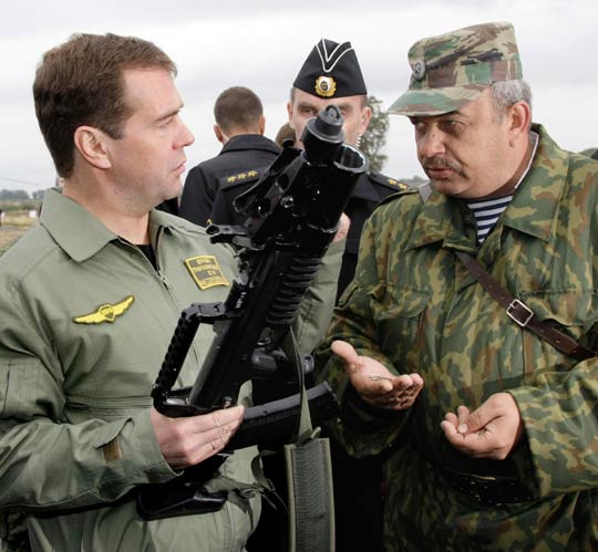 電視畫面顯示,梅德韋杰夫身著海軍夾克!睹咳针娪崍(bào)》報(bào)道,軍服上有徽章顯示“D.A. 梅德韋杰夫,俄羅斯聯(lián)邦武裝部隊(duì)總司令”,軍服上還有一面小的俄羅斯國旗。在演習(xí)現(xiàn)場,梅德韋杰夫端起一把機(jī)槍,饒有興致地查看各種裝備,并不時(shí)同俄羅斯軍隊(duì)高官交談。