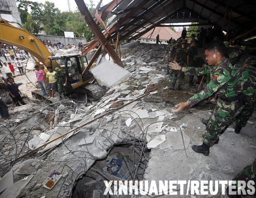 10月1日,在印度尼西亞西蘇門答臘省的巴東,士兵在一所學(xué)校中尋找遇難者。印尼西蘇門答臘省9月30日下午發(fā)生里氏7.6級地震。新華社/路透