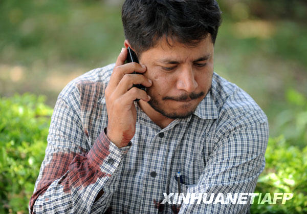 10月5日,在巴基斯坦首都伊斯蘭堡,一名身上有血跡的聯(lián)合國(guó)雇員在發(fā)生爆炸的辦公室外打電話。巴基斯坦警方稱,聯(lián)合國(guó)駐巴機(jī)構(gòu)位于巴首都伊斯蘭堡的辦公室附近當(dāng)天發(fā)生爆炸,造成至少3人死亡,爆炸原因目前尚不清楚。新華社/法新