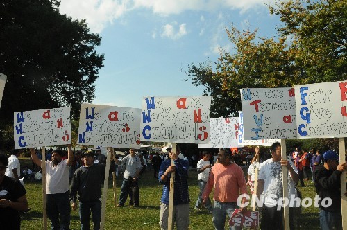 十月十三日,來(lái)自馬薩諸塞州、新罕布什爾州等的二十多個(gè)倡導(dǎo)移民改革團(tuán)體組織數(shù)千人在國(guó)會(huì)山舉行綜合移民改革大型集會(huì)。圖為集會(huì)者高舉自己制作的標(biāo)語(yǔ),上面寫著“我們是工人不是罪犯”等標(biāo)語(yǔ)。 中新社發(fā) 吳慶才 攝