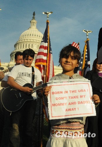當(dāng)?shù)貢r(shí)間十月十三日,來(lái)自馬薩諸塞州、新罕布什爾州等的二十多個(gè)倡導(dǎo)移民改革團(tuán)體組織數(shù)千人在國(guó)會(huì)山舉行綜合移民改革大型集會(huì)。圖為一名小女孩舉著“出生在美國(guó),不要把我的錢和我的爸爸帶走”。 中新社發(fā) 吳慶才 攝