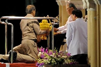 81歲的泰王普密蓬在王后詩麗吉、哇集拉隆功王儲、王室家庭成員以及首相阿披實的陪同下,出席了該活動。他身穿一件白色的外套,坐在輪椅上向數(shù)百名前來為他祈福的民眾揮手。