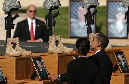 奧巴馬在遇難者悼念儀式上發(fā)表了講話。登上講臺后,他示意聚集現(xiàn)場聽眾安靜下來,然后開始逐一介紹每一名遇難者的姓名、軍銜、履歷等,回顧了他們的家庭、生活情況以及對軍隊的貢獻(xiàn)。