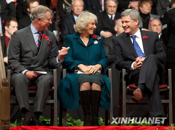 11月2日,在加拿大東部城市圣約翰,英國王儲查爾斯(左一)與妻子卡米拉同加拿大總理哈珀交談。英國王儲查爾斯夫婦2日抵達圣約翰,開始對加拿大進行為期11天的訪問。新華社發(fā)