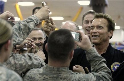 周一,美國加州州長施瓦辛格受到駐伊美軍士兵歡迎