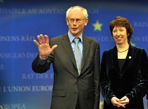 比利時(shí)首相赫爾曼·范龍佩(左)和歐盟貿(mào)易委員凱瑟琳·阿什頓在當(dāng)選后出席新聞發(fā)布會(huì)。