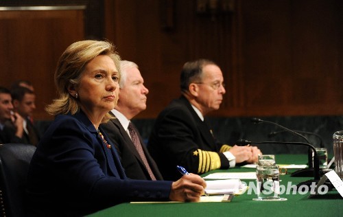 美國(guó)國(guó)務(wù)卿希拉里、國(guó)防部長(zhǎng)蓋茨(中)、美國(guó)參謀長(zhǎng)聯(lián)席會(huì)議主席馬倫2日上午共同出席參議院有關(guān)新阿富汗戰(zhàn)略的聽(tīng)證會(huì)。希拉里表示,美國(guó)并未鎖定撤出阿富汗,提出撤軍時(shí)間表是為了表明美國(guó)無(wú)意占領(lǐng)阿富汗。 中新社發(fā) 李靜 攝