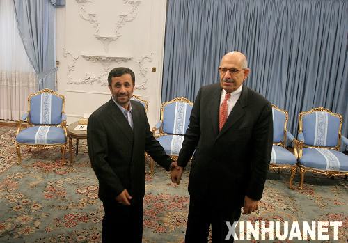 資料圖片:10月4日,在伊朗首都德黑蘭,伊朗總統(tǒng)艾哈邁迪-內(nèi)賈德(左)會見國際原子能機構(gòu)總干事巴拉迪。巴拉迪3日傍晚抵達伊朗進行訪問,并將在訪問期間著重就伊朗核問題與伊朗官員進行對話。 新華社發(fā) (哈拉比薩斯攝)