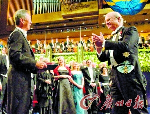 10日,在瑞典首都斯德哥爾摩舉行的2009年諾貝爾獎頒獎儀式上,瑞典國王卡爾十六世?古斯塔夫向華裔科學(xué)家高錕(左)頒獎。
