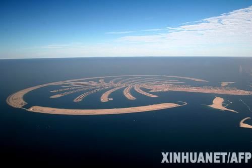 聳立在迪拜的眾多獨特建筑之一,遠處為巨型人工島——棕櫚島一角。新華社/法新