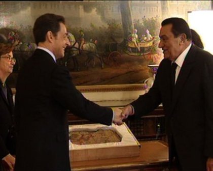 法國(guó)總統(tǒng)薩科齊向到訪(fǎng)的埃及總統(tǒng)穆巴拉克歸還埃及石碑文物