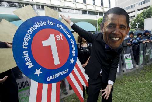 綠色和平組織成員戴著奧巴馬的面具,抗議美國(guó)政府的氣候政策。