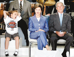 布什夫婦參加一社區(qū)服務(wù)項(xiàng)目,布什發(fā)呆的樣子,與旁邊伸懶腰打呵欠的小女孩相映成趣。
