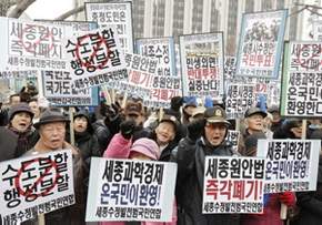 韓國民眾在政府大樓前高舉標(biāo)語,表示對修改世宗市規(guī)劃的支持。