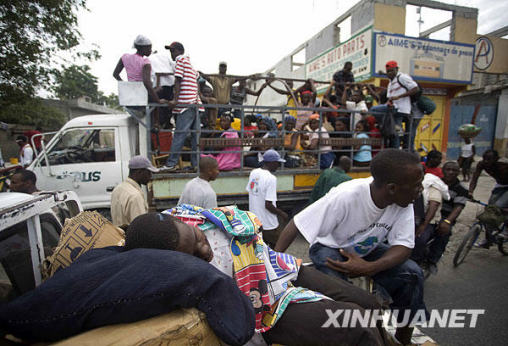 1月14日,當(dāng)?shù)鼐用裨噲D離開海地首都太子港。海地當(dāng)?shù)貢r間12日下午發(fā)生強烈地震和多起余震,造成首都太子港大量房屋受損或倒塌,當(dāng)?shù)厝耸糠Q地震可能造成數(shù)萬人死亡。新華社記者戴維攝