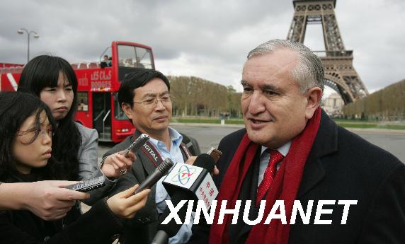 資料圖片:2008年4月6日,拉法蘭在巴黎埃菲爾鐵塔前接受部分中國(guó)駐法媒體記者聯(lián)合采訪。