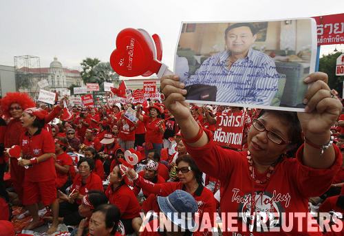 資料圖片:2009年10月17日,在泰國首都曼谷,泰國民間政治團體反獨裁民主聯(lián)盟(反獨聯(lián))的支持者“紅衫軍”手持前總理他信的照片參加集會!凹t衫軍”17日下午在曼谷舉行集會,要求政府公布對于赦免前總理他信請愿書審查工作的進展。新華社/路透