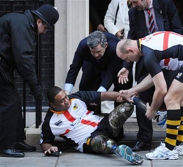 據(jù)香港《文匯報(bào)》報(bào)道,其中一名雙腿殘廢、靠義肢行動(dòng)的球員,被首相府門外的石階絆倒,跌坐地上。眼不明但手快的布朗及時(shí)伸出援手。