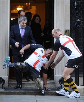 中新網(wǎng)2月3日電 英國(guó)首相布朗前日邀請(qǐng)橄欖球隊(duì)球員到唐寧街首相府,宣傳本年4月底一場(chǎng)為受傷英兵籌款的慈善賽。
