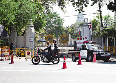 泰國(guó)最高法院門(mén)前,軍警加強(qiáng)保安工作。